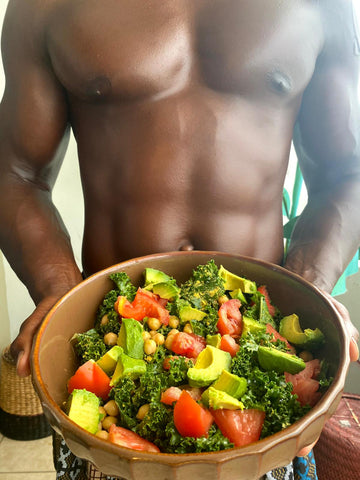 Add kale in a bowl with 1/2 teaspoon of Himalayan sea salt and 1 tablespoon of oil. Massage the kale until it's dark green. Add nutritional yeast. Mix in the following ingredients avocado carrots, hemp seeds, pumpkin seeds, chickpeas, and tomato. Add balsamic vinegar. Add Himalayan sea salt and cayenne to taste.